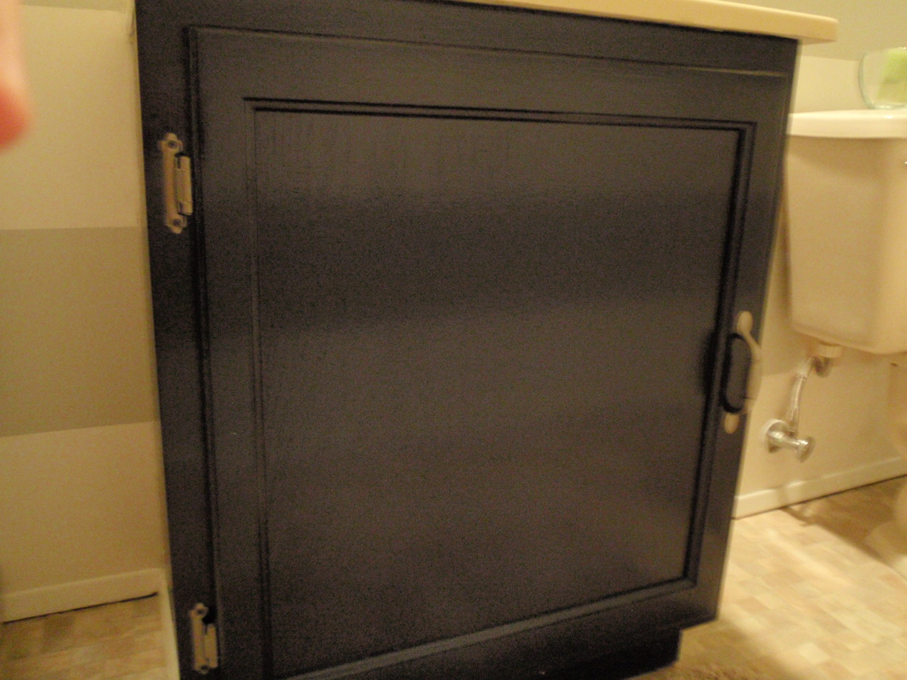 Notice the handle on the cabinet? I sprayed the hinges and the knob with 3 coats of stainless steel Rustoleum spray paint that I had left over from a kitchen project.